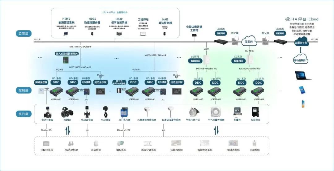 EBA能源樓控系統(tǒng)具體包括Lora無線聯(lián)網計量一體型溫控器、智能網關、邊緣計算網絡引擎、IOT-DDC、HAI可視化智慧運營運維運管平臺等明星產品及平臺,智能管控覆蓋暖通空調機房冷熱源設備、水泵等輸配設備以及室內環(huán)境側風機盤管等空調設備。