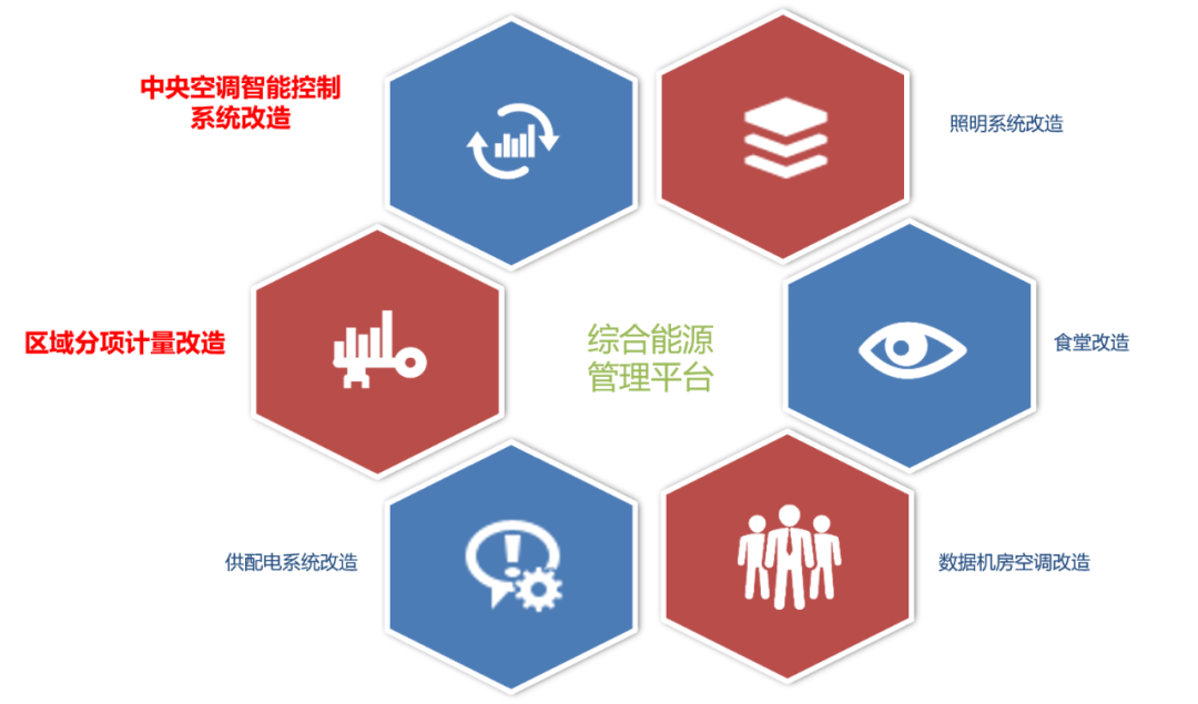 一期E座和二期ABCD座,合計(jì)改造面積26.6萬平。分為:水、電、燃?xì)獾姆謶舴猪?xiàng)計(jì)量,中央空調(diào)的智能控制,智能照明系統(tǒng),供配電系統(tǒng)智能化監(jiān)控,食堂改造,數(shù)據(jù)機(jī)房空調(diào)改造,綜合能源管理平臺(tái)建設(shè)等7個(gè)部分。