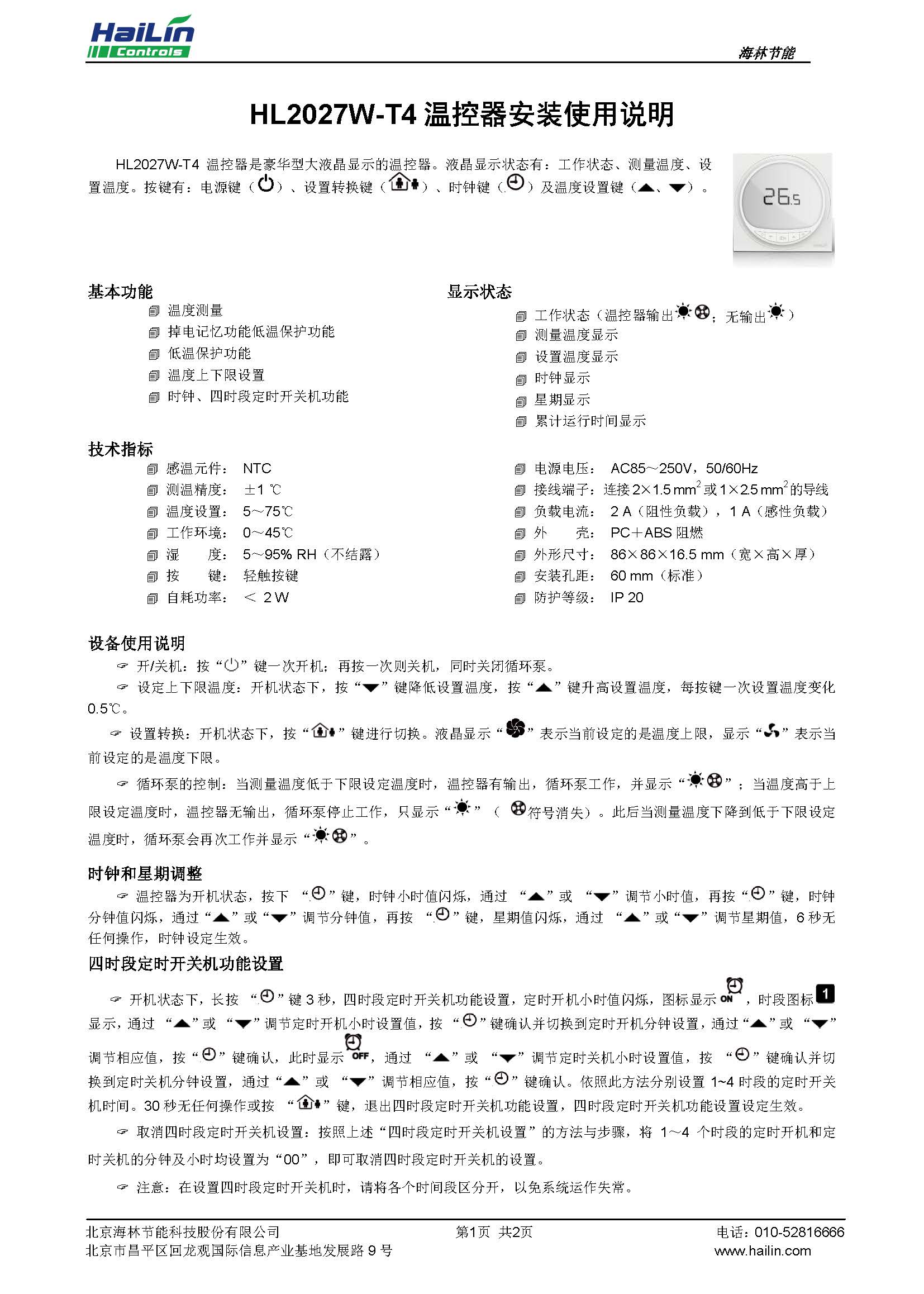 HL2027W-T4 溫控器是豪華型大液晶顯示的溫控器。液晶顯示狀態(tài)有:工作狀態(tài)、測量溫度、設(shè) 置溫度。